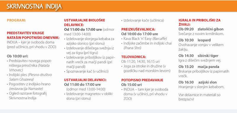 V ZOO Ljubljana boste lahko skozi celotni dan obiskali biološke delavnice o živalih, izdelali igračo zanje, preizkusili popotniško kavo, tradicionalni chai in indijsko hrano, obiskali delavnico joge za družine ter se na potopisnem predavanju podali na pot v Indijo.